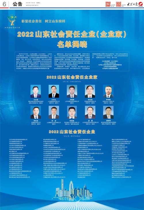 “2022山東社會責(zé)任企業(yè)(企業(yè)家)”推選活動,經(jīng)資料賦分、網(wǎng)絡(luò)投票、初審?fù)镀?、專家終審、媒體公示等程序,全省共有81家企業(yè)獲選“2022山東社會責(zé)任企業(yè)”,10名企業(yè)家上榜“2022山東社會責(zé)任企業(yè)家”。